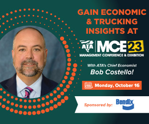 | | Advertisement | Catch Bob Costello's 2023 ATA Management Conference & Exhibition (MCE) session for crucial insights on the economy, labor market, and forecasts for the future. This valuable trucking industry data will guide smarter business decisions. |