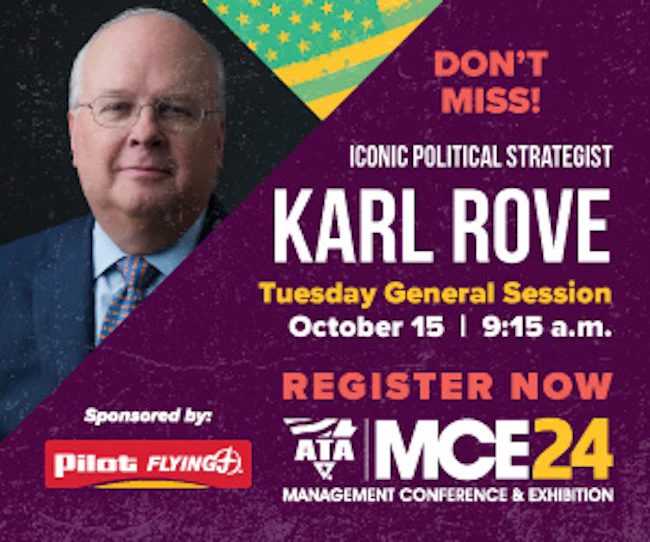 | | | | | | Sponsored | | Trucking’s premier event is coming soon. Attend ATA’s 2024 Management Conference & Exhibition and hear from iconic political strategist Karl Rove who will share his insights into the shifting political landscape and how it’ll affect our industry just weeks ahead of Election Day. Be part of this conversation and more when you join us in Nashville, October 12-15. |